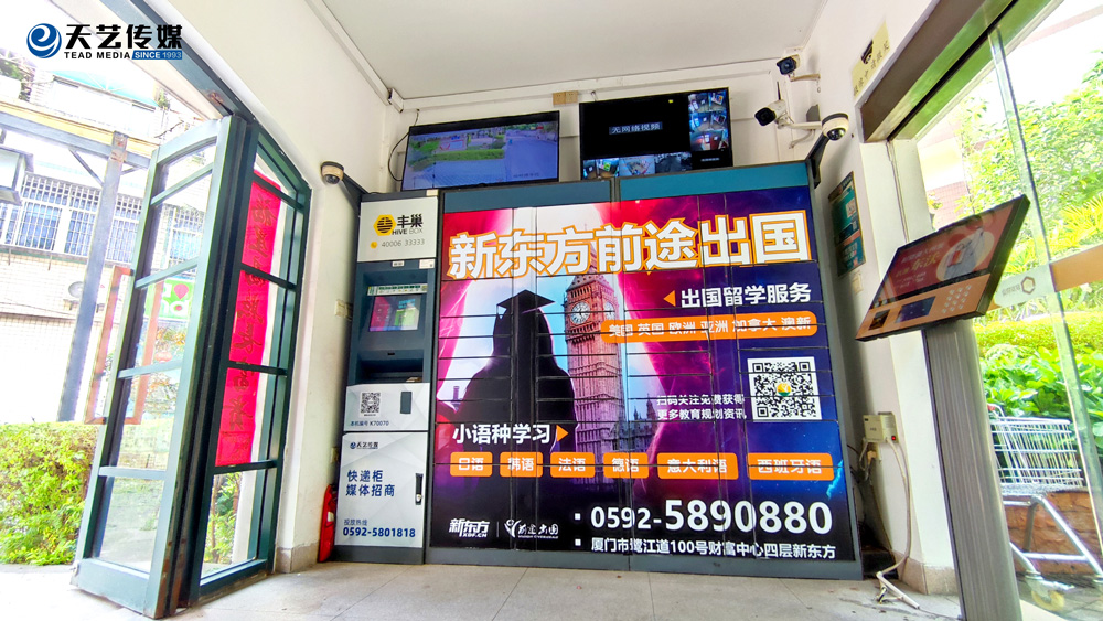 廈門新東方前途出國(guó)服務(wù)機(jī)構(gòu)位于鷺江道財(cái)務(wù)中心四樓,與廈門天藝傳媒合作,目前在主干道路名牌與生活小區(qū)的快遞柜媒體進(jìn)行部分宣傳合作。